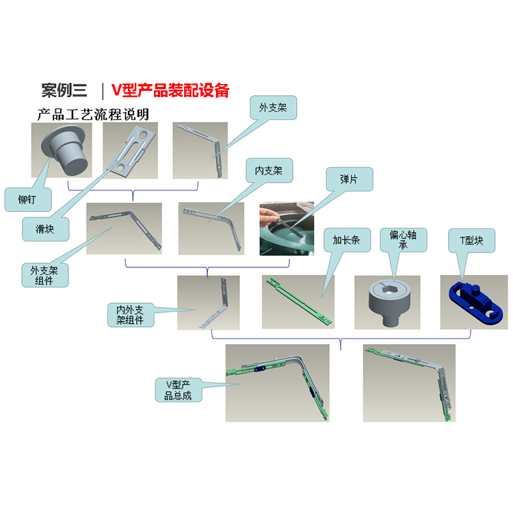 該設(shè)備自動(dòng)完成V型產(chǎn)品的裝配、旋抑、涂油及檢測。產(chǎn)品所有零件采用振動(dòng)盤或者彈夾自動(dòng)上料、設(shè)備通過有無檢測、高度檢測以及CCD檢測自動(dòng)區(qū)分良品和不良品。合格產(chǎn)品自動(dòng)輸送到成品盤。